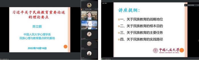 10月16日,中国人民大学陈立鹏教授作了题为《习近平关于民族教育重要论述的理论要点》的学术报告。陈立鹏谈到上午习近平总书记在党的二十大报告第五点专门作了教育和科技创新的报告,民族教育的质量关系到全国大局教育公平的落实,学习贯彻习近平总书记关于民族教育重要论述具有重大意义,据此深入分析了习近平总书记党的十八大以来关于民族教育的一系列论述,揭示了民族教育的战略地位。